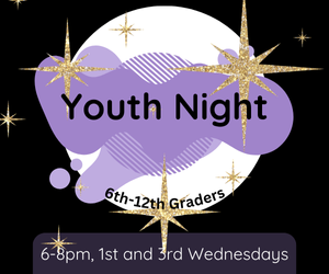 Youth Night title banner. Grades 6th through 12th from 6 pm to 8pm. Black lettering over purple splash and gold stars.